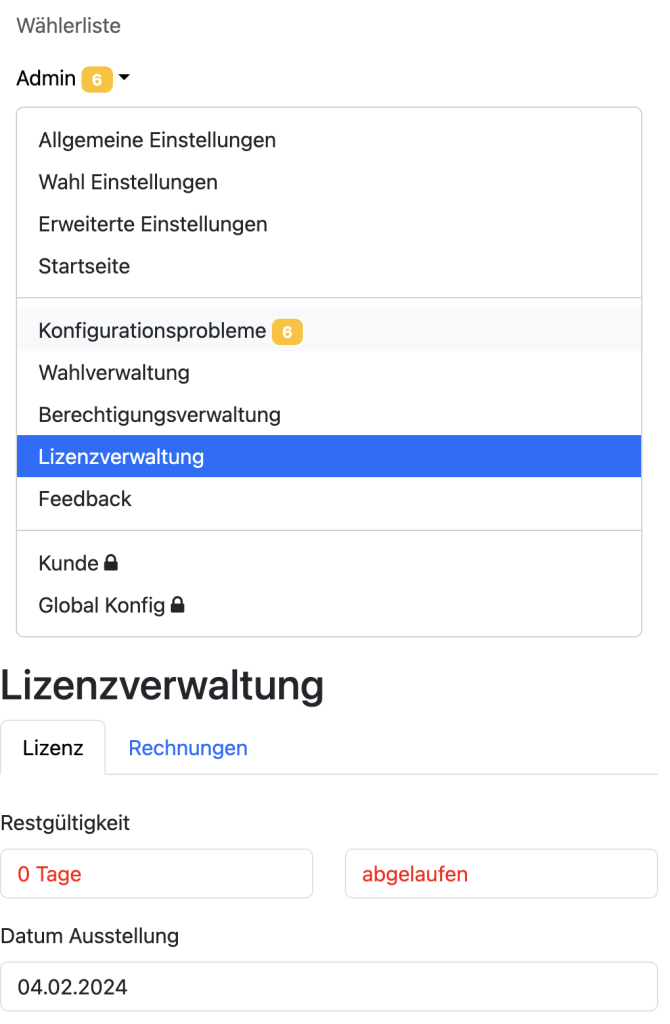 Nach Ablauf des kostenlosen Testzeitraums gibt es keine automatische Verlängerung. Sie können aber für weitere Wahlen eine neue Nutzungslizenz erstellen. Sie finden die Lizenzverwaltung im Admin Menü (Admin -> Lizenzverwaltung)