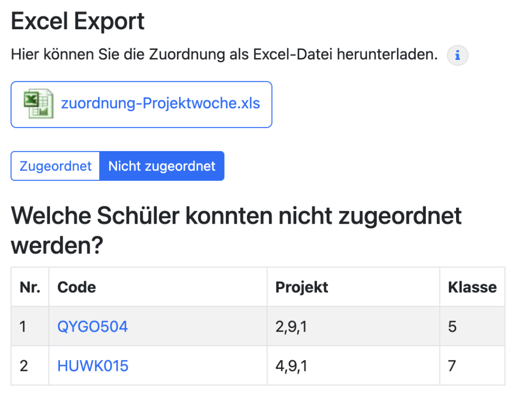 Die Liste der nicht zugeordneten Schüler finden Sie im Menüpunkt Zuordnung. [Demo]. Sie sehen, dass ein Schüler mit dem Code QYGO504 die Projekte 2,9,1 gewählt hat und nicht zugeordnet werden konnte.