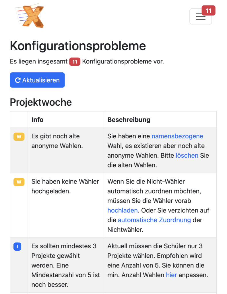 Im Beispiel finden Sie für alle Wahlen die potentiellen Konfigurationsprobleme incl. einer Beschreibung. Die Probleme sind nach Schweregrad kategorisiert: